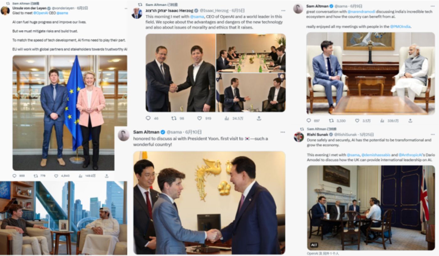 据媒体统计,在几周的时间里,他惊人地访问了22个国家,始终保持着谦逊的姿态,友好且热情,向各国领导人们宣称自己支持对人工智能进行监管,但同时也表达出对于监管过度的担忧。