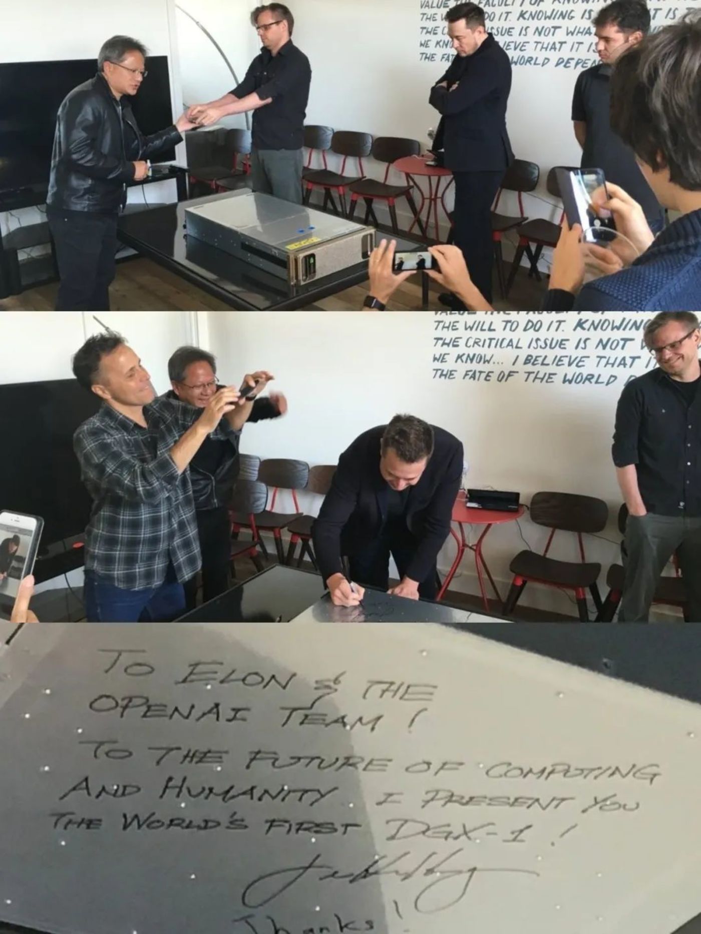 9年前,黄仁勋第一次向OpenAI赠送全球第一台DGX-1超级计算机的时候,留言“To ELON &THE OPENAI TEAM!”,丝毫未提及奥特曼的名字。在那场大佬会面留下的照片资料里,也不见奥特曼的身影。