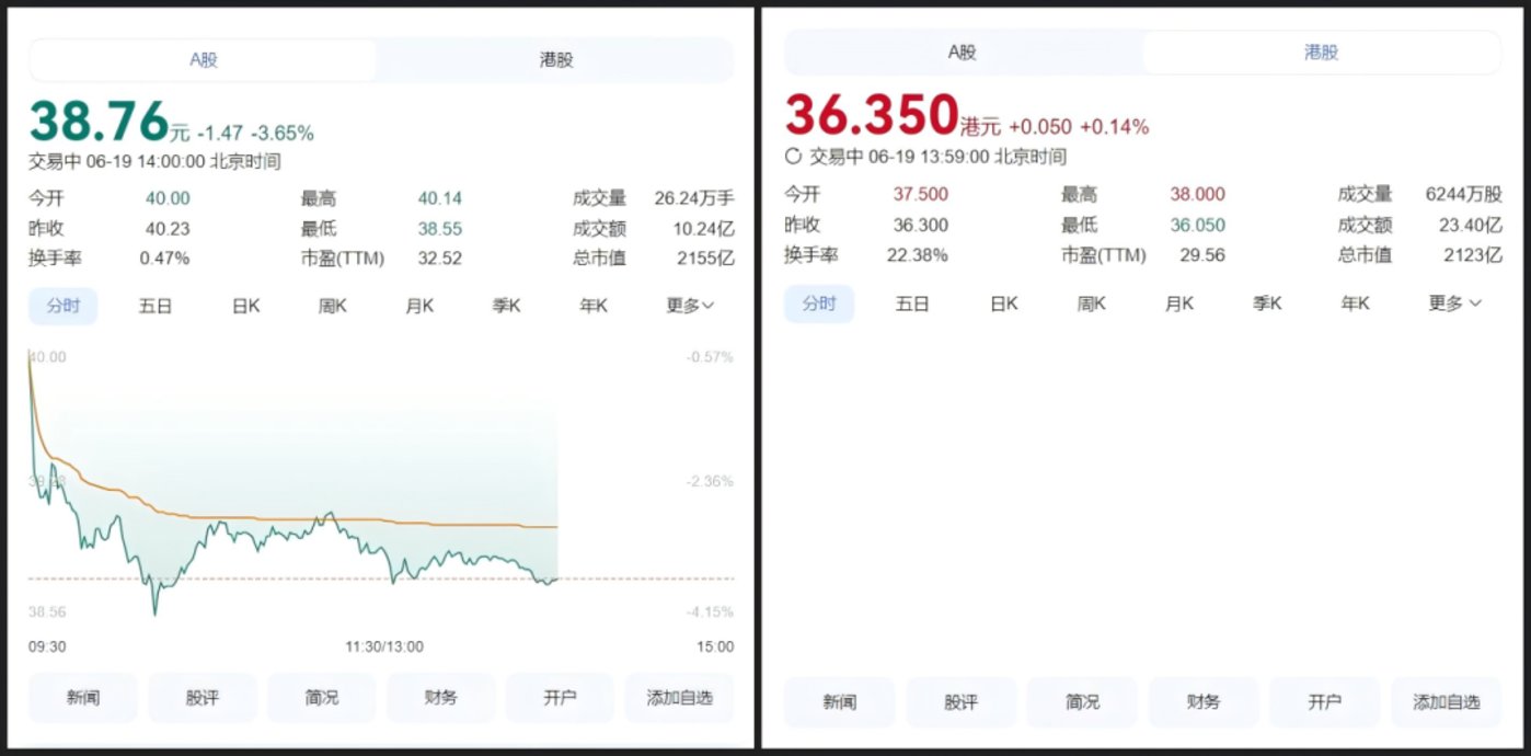 上市首日,海天味业开盘价为37.5港元,较发行价(36.3港元)上涨3.3%。截至当日收盘,海天味业股价为36.6港元,市值2137亿港元(约合1957亿元),大约为A股(2151亿元)市值的90%。
