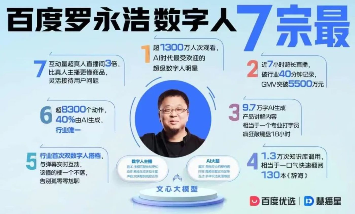 6月17日,百度副总裁、百度电商总经理平晓黎,进一步公开了罗永浩数字人所采用的技术和解决方案,她透露,“数字人罗永浩”背后是百度研发的多模协同的数字人技术,这也是业界首个上线的双数字人互动直播间,当天直播总时长共计约7小时,其中罗永浩真人直播2小时左右,数字人直播约5小时,共吸引了超130万人次观看。