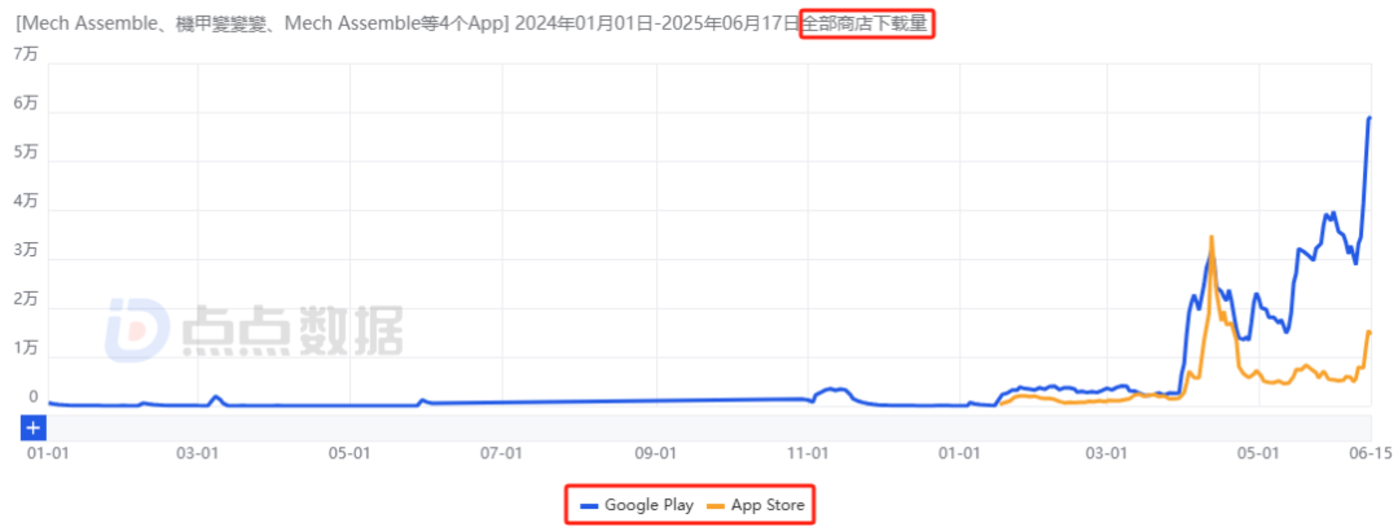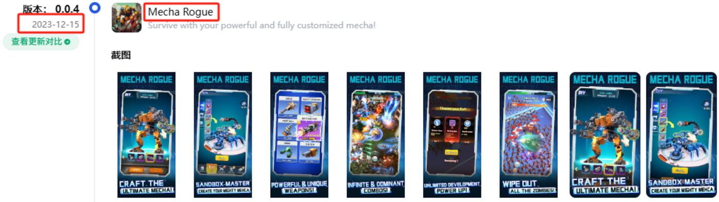 点点数据显示,《Mech Assemble》最早于2023年12月中旬上架美国Google Play,当时还是以《Mecha Rogue》的游戏名进行前期素材及玩法的验证。