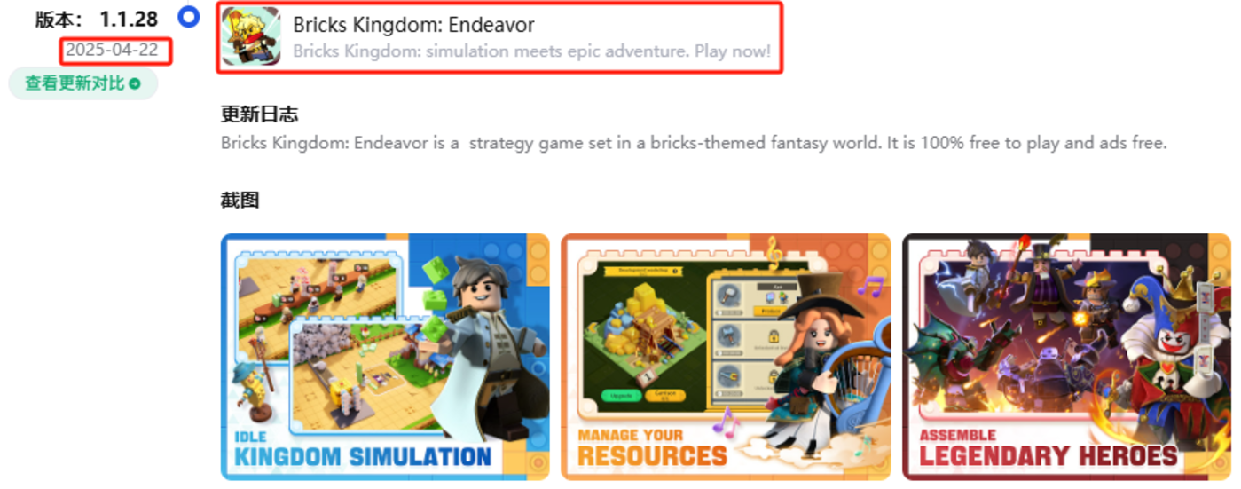 值得一说的是,近一个季度里《Bricks Kingdom》几乎停止了投放动作,但在2025年4月中下旬,ONEMT又推出了该作的迭代产品《Bricks Kingdom: Endeavor》。