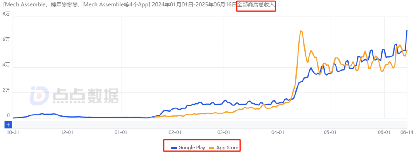 然而,近期点点出海发现在该厂商2024年高频推出的一众新游里,似乎终于跑出了一款名为《Mech Assemble》的潜力新作,其今年4月正式上线多个国家及地区,当月下载量环比增长558%,5月时流水便冲至2000万左右,环比增长43%。