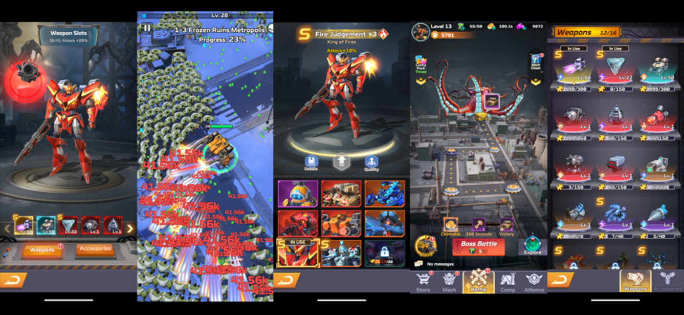 与之对应在变现和资源分布方面,虽然通过内购可以升级机甲的属性从而提升战斗力,但很大一部分关键武器还是需要玩家通过节点关卡才能够获得。如此,等于利用题材对游戏的营收和留存两个方面都产生了正面影响。