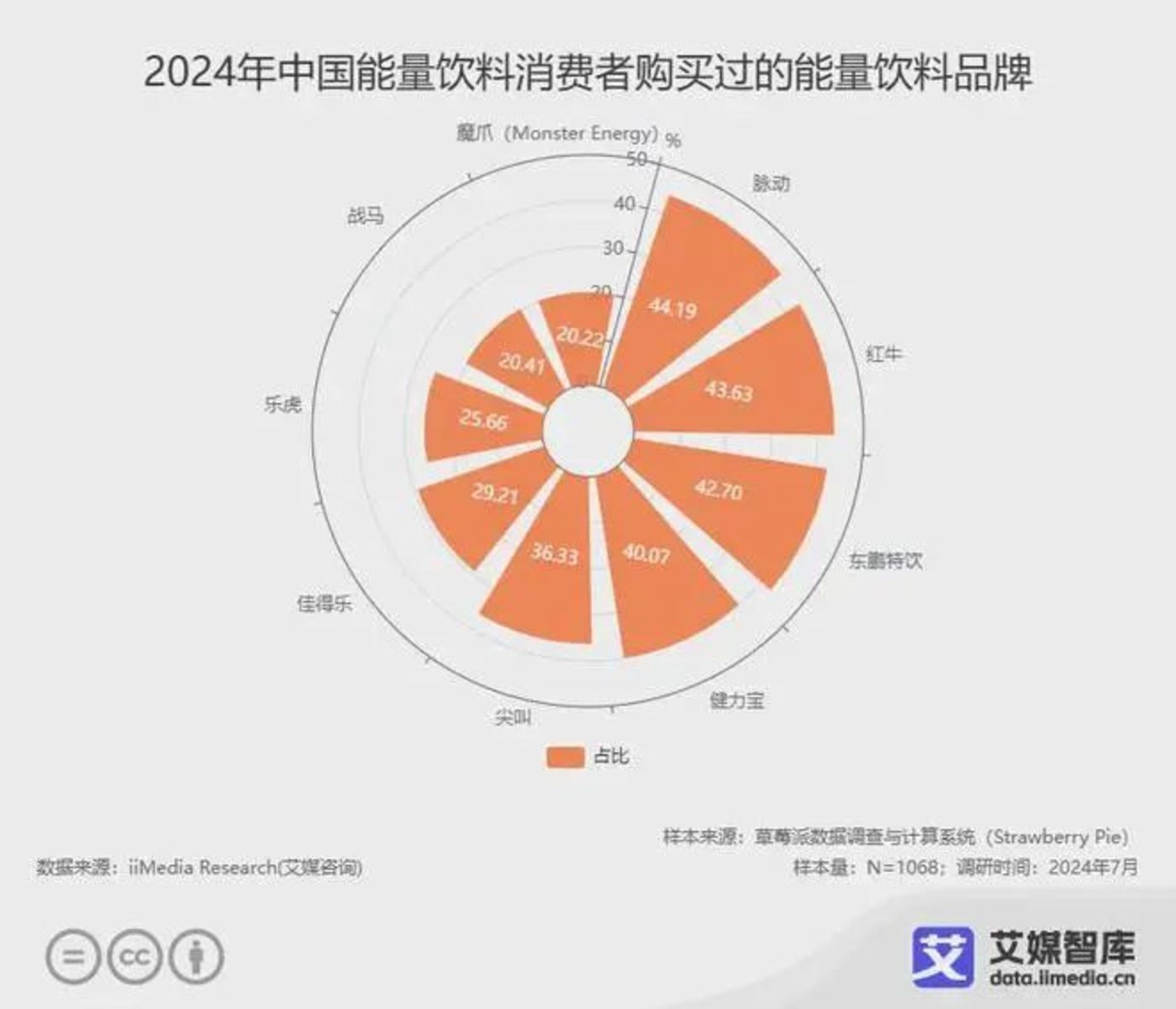 根据艾媒咨询报告,我国44.19%消费者购买过脉动,占比最高;其次是红牛(43.63%)和东鹏特饮(42.70%);排在四至七位的,分别是健力宝(40.07%)、尖叫(36.33%)、佳得乐(29.21%)、乐虎(25.66)。
