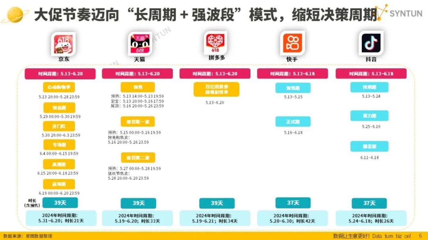 受益于国补政策以及大促周期的再度拉长,第三方机构统计的今年 618 总体 GMV 仍处于上涨之中。星图数据称今年 618 综合电商销售总额(天猫、京东、拼多多、抖音及快手)为 8556 亿元,同比增长 15.2%。他们同时强调今年 618 大促周期与去年有较大差异,同比增长数据仅供参考。易观给出的数据是综合电商平台(淘天、京东、拼多多)GMV 同比增长 9.4%。