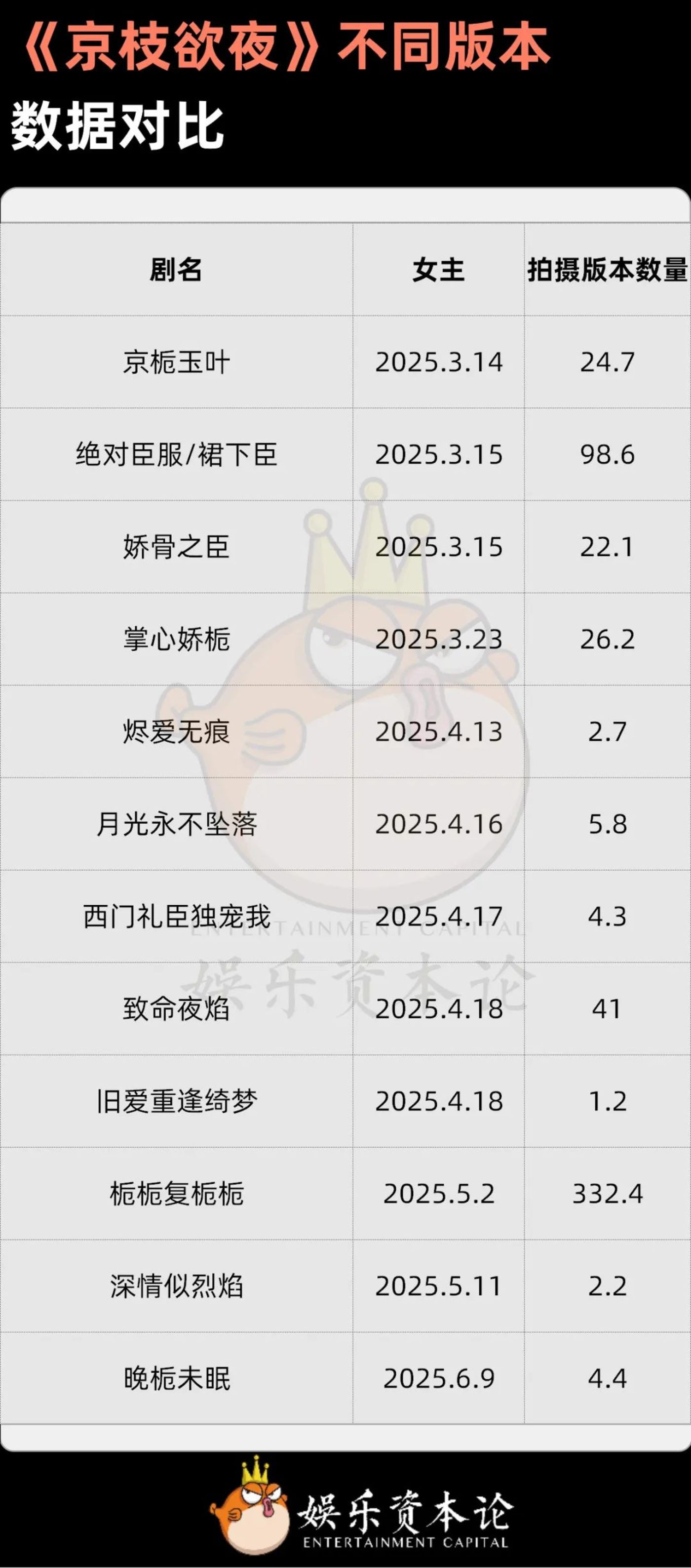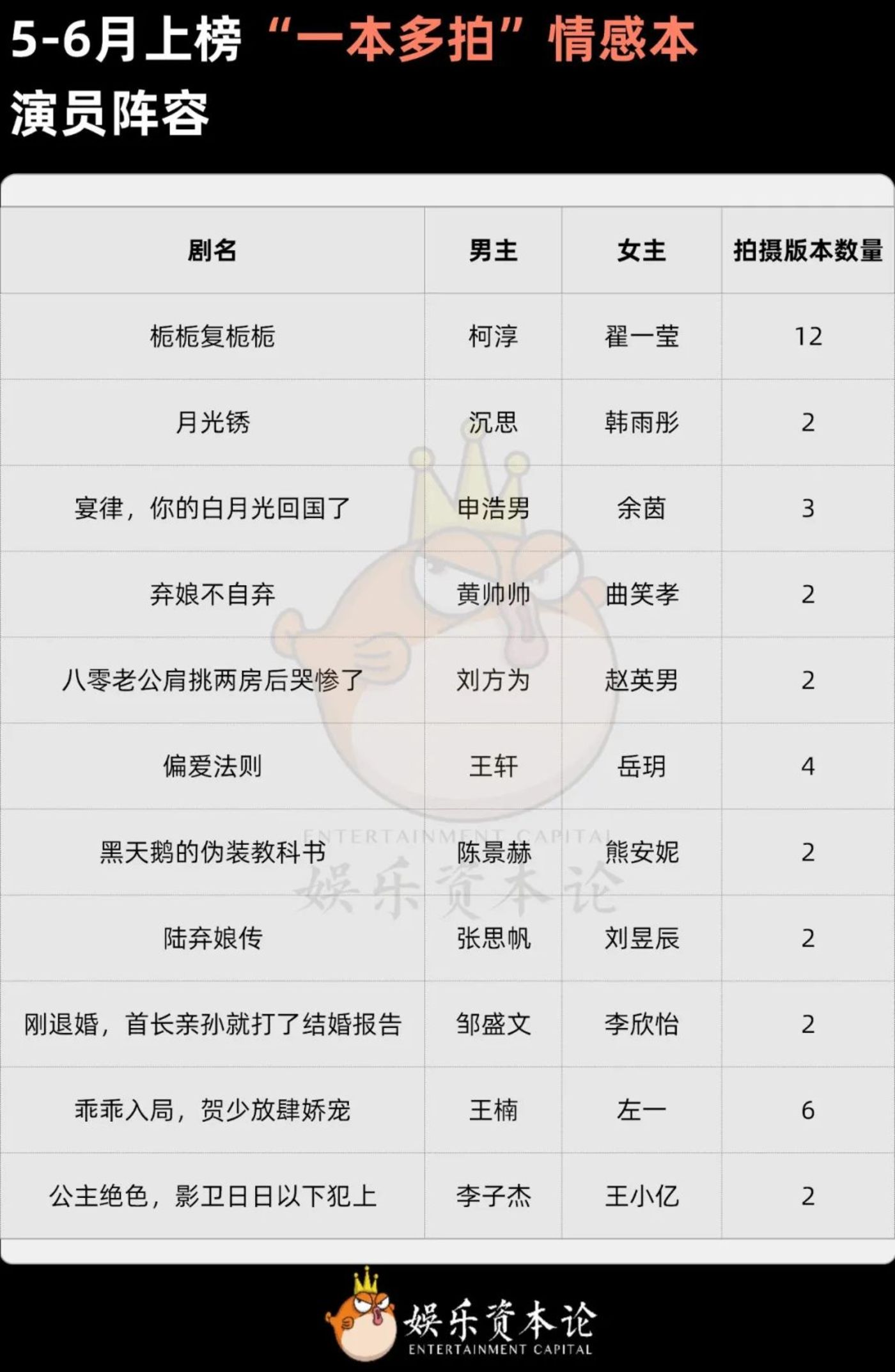 根据娱乐资本论统计,在5至6月上榜的“一本多拍”剧中,情感本的占比接近70%。相较于非情感本同一赛道中能够跑出多个爆款的情况,情感本往往只有一个版本能够热度断层领先。