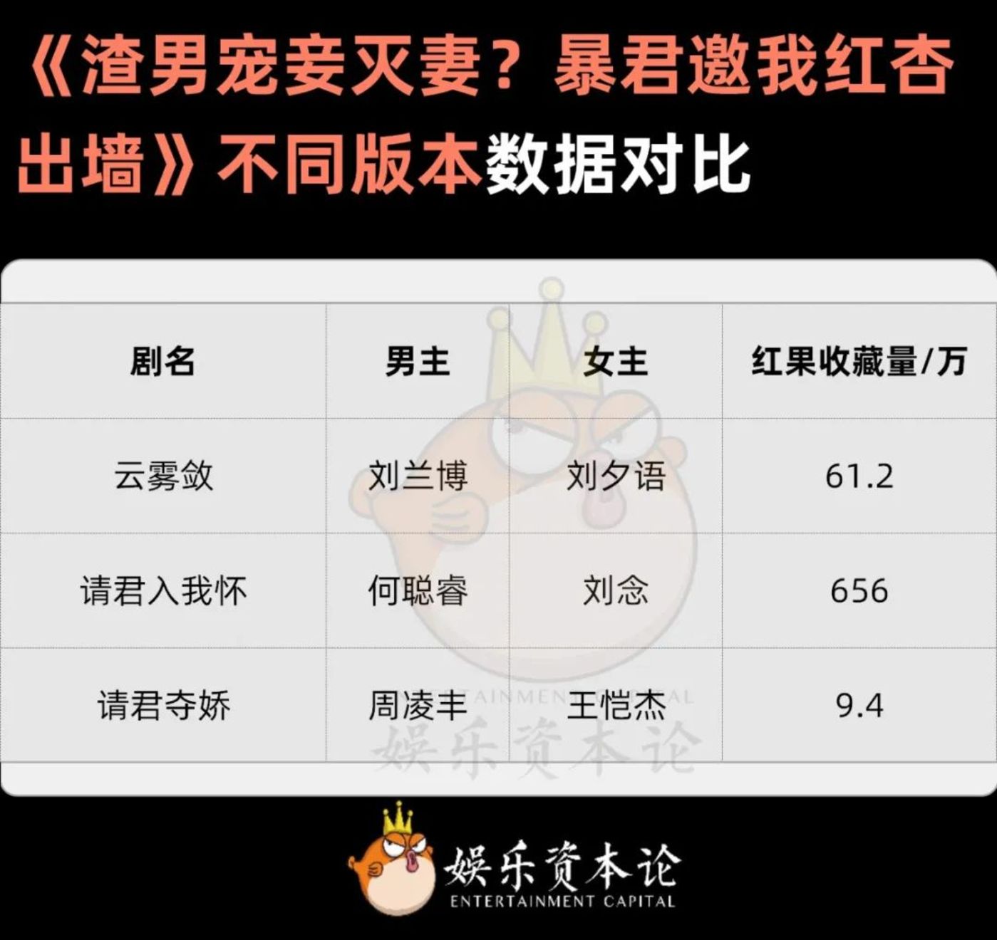 但由听花岛承制、旗下艺人刘念出演的版本依旧成为该赛道当之无愧的胜出者,不仅累计热力值达到3017.5万,红果收藏量也有656万。其它版本的红果收藏量叠加,依旧无法超越《请君入我怀》的数据,这一现象“绝对就是人捧剧”。