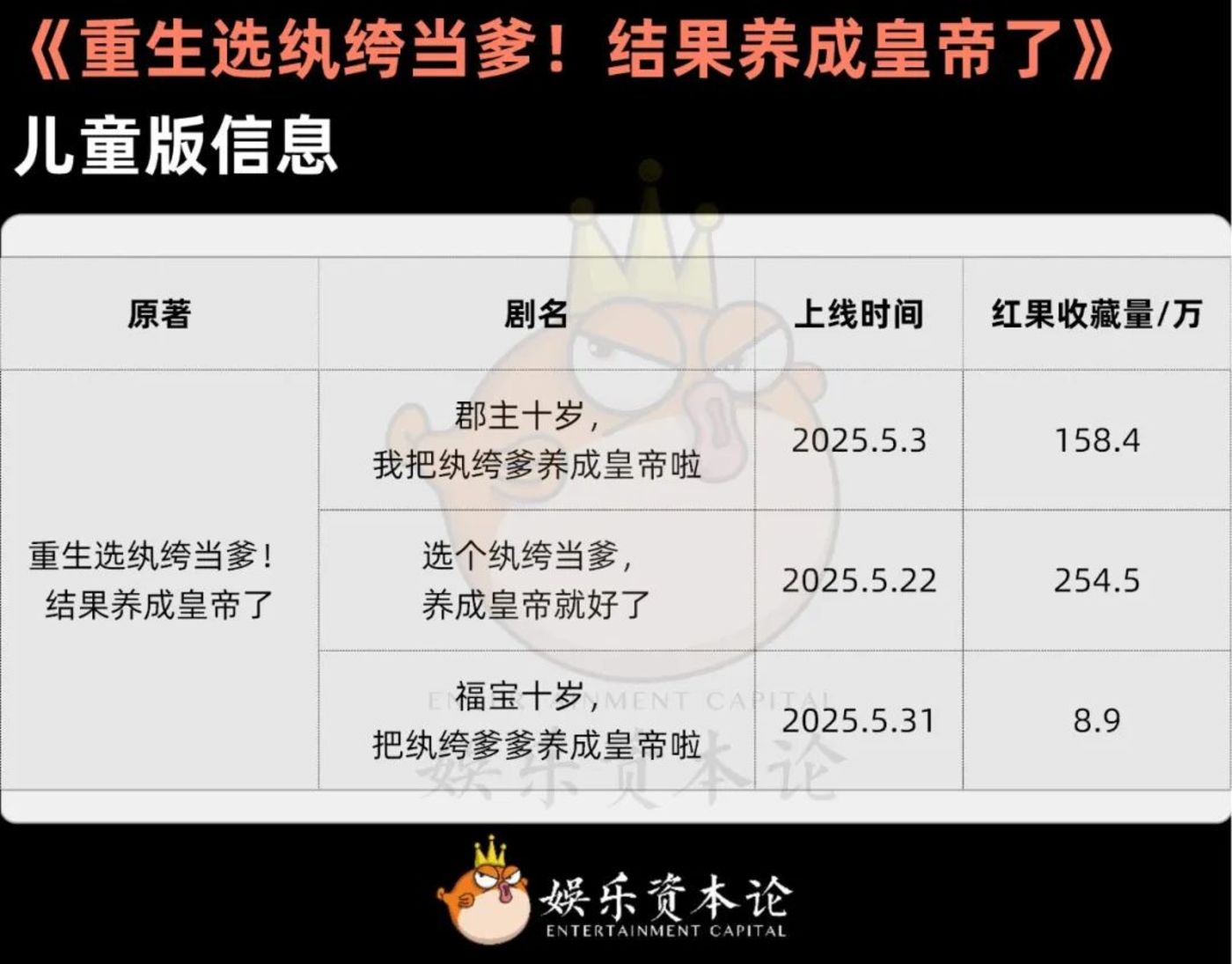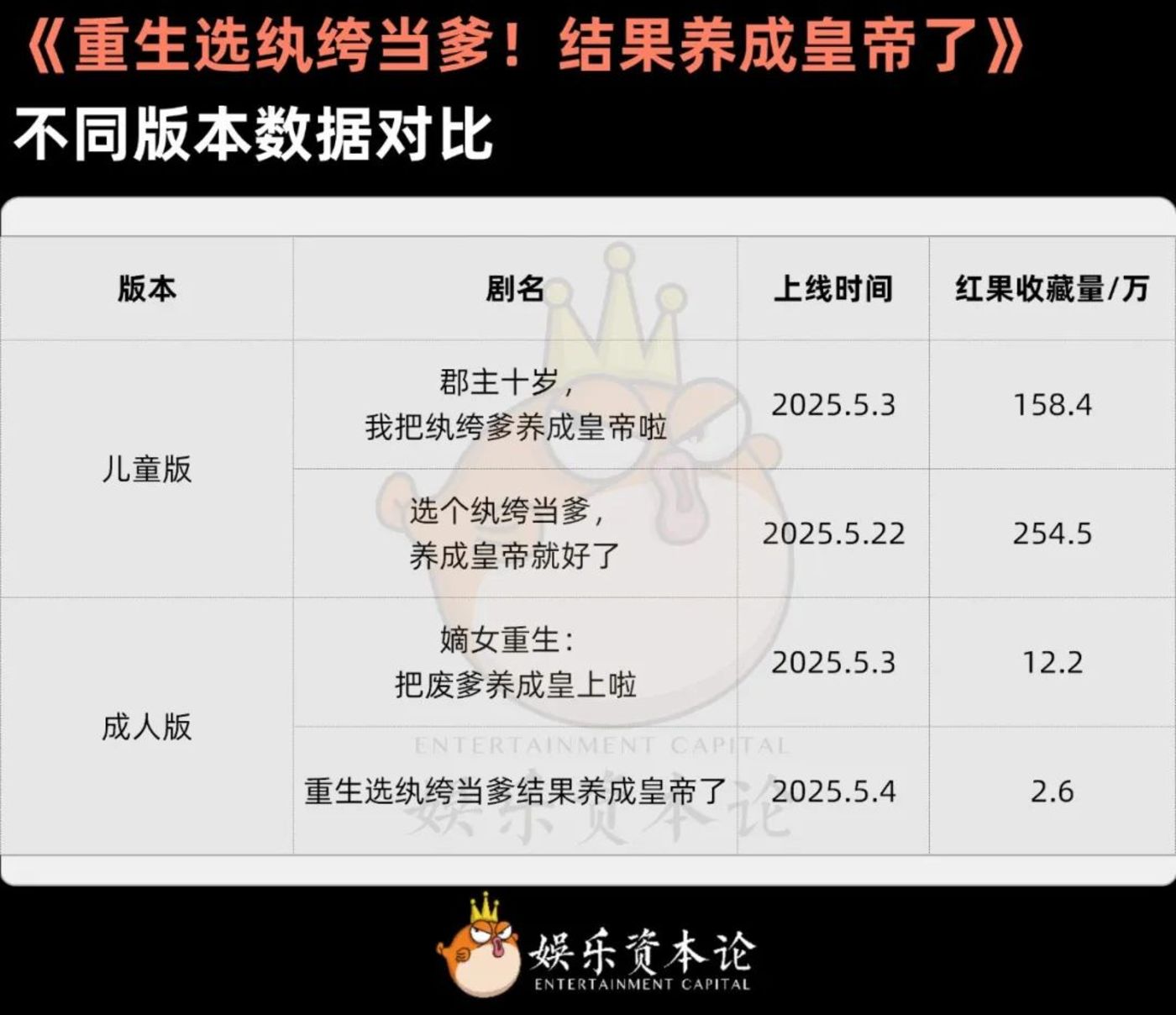 《重生选纨绔当爹!结果养成皇帝了》除了三版儿童版外,还有两版成人版同期上线,其中《嫡女重生:把废爹养成皇上啦》与《郡主十岁,我把纨绔爹养成皇帝啦》甚至是同天上线,但与两部爆款相比,成人版的热度与相关数据均差距鲜明。