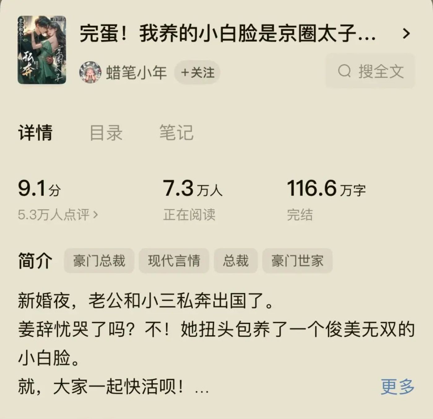 《完蛋!我养的小白脸是京圈太子爷》因此翻拍了12版,在未被改编成短剧时,这本小说已经是番茄的头部大IP,不仅由5.3万人打出了9.1的高分,完结三个月后实时阅读人数依旧能突破7万。