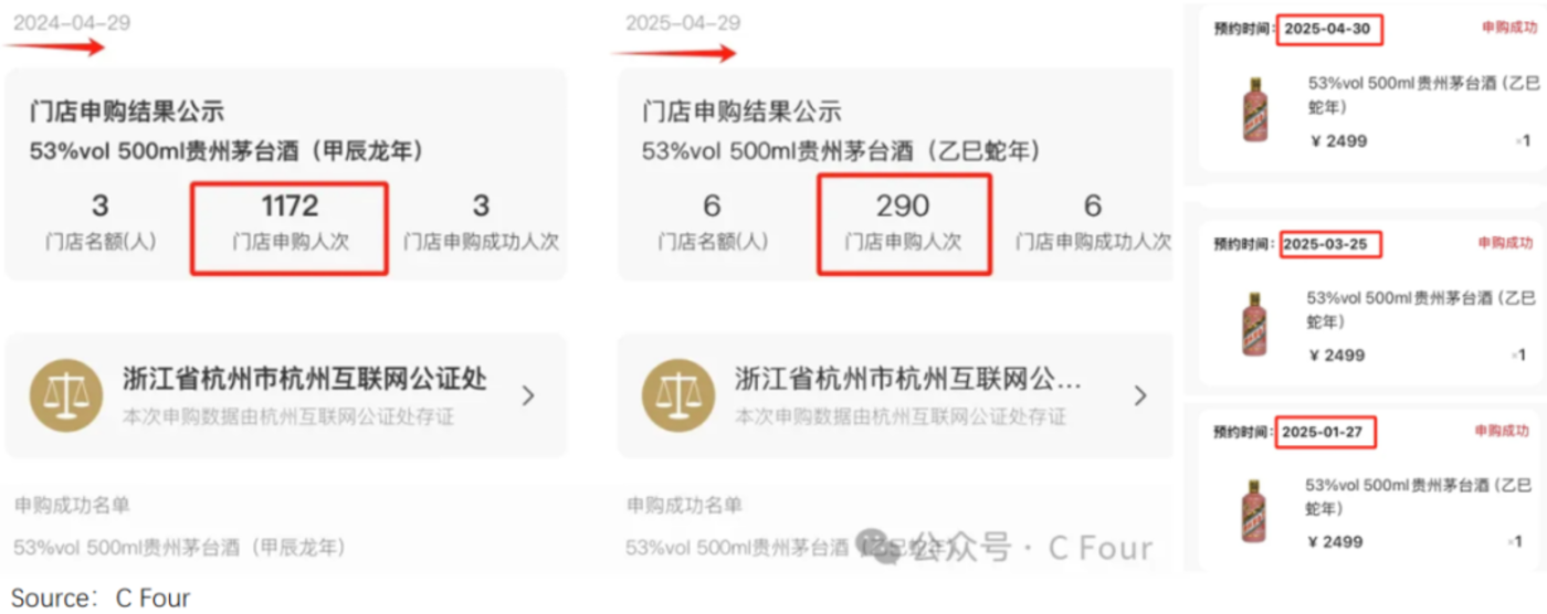 黄牛们逐渐退场,老陈发现,酒贩子不参与,申购茅台生肖酒的人明显变少:去年同一时间有1000多人申购,今年不到300人,创下新低。