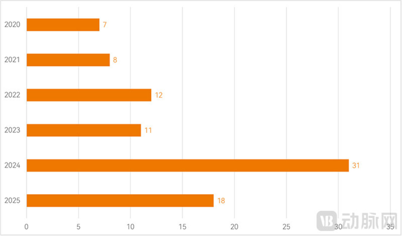 根据不完全统计,近年来我国脑机接口相关临床试验数量走高趋势明显。尤其在2024年有31项脑机接口相关临床试验注册,数量几乎是2023年的三倍之多。2025年则维持了快速增长的趋势,不到半年已有18起脑机接口临床试验,全年有望超越2024年的水平,创下历年之最。