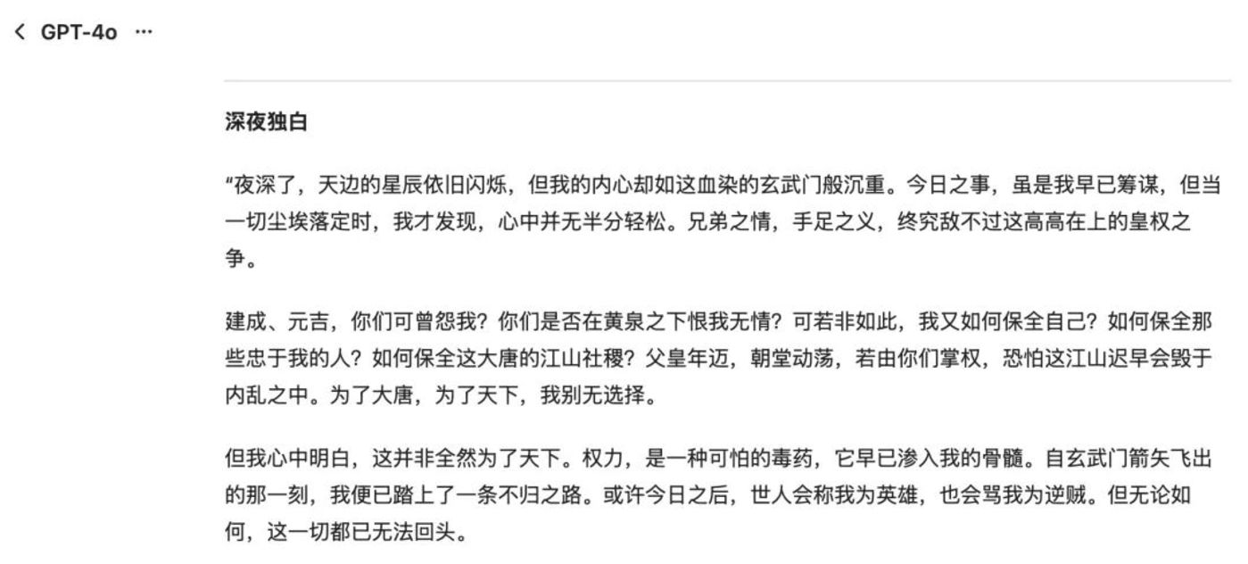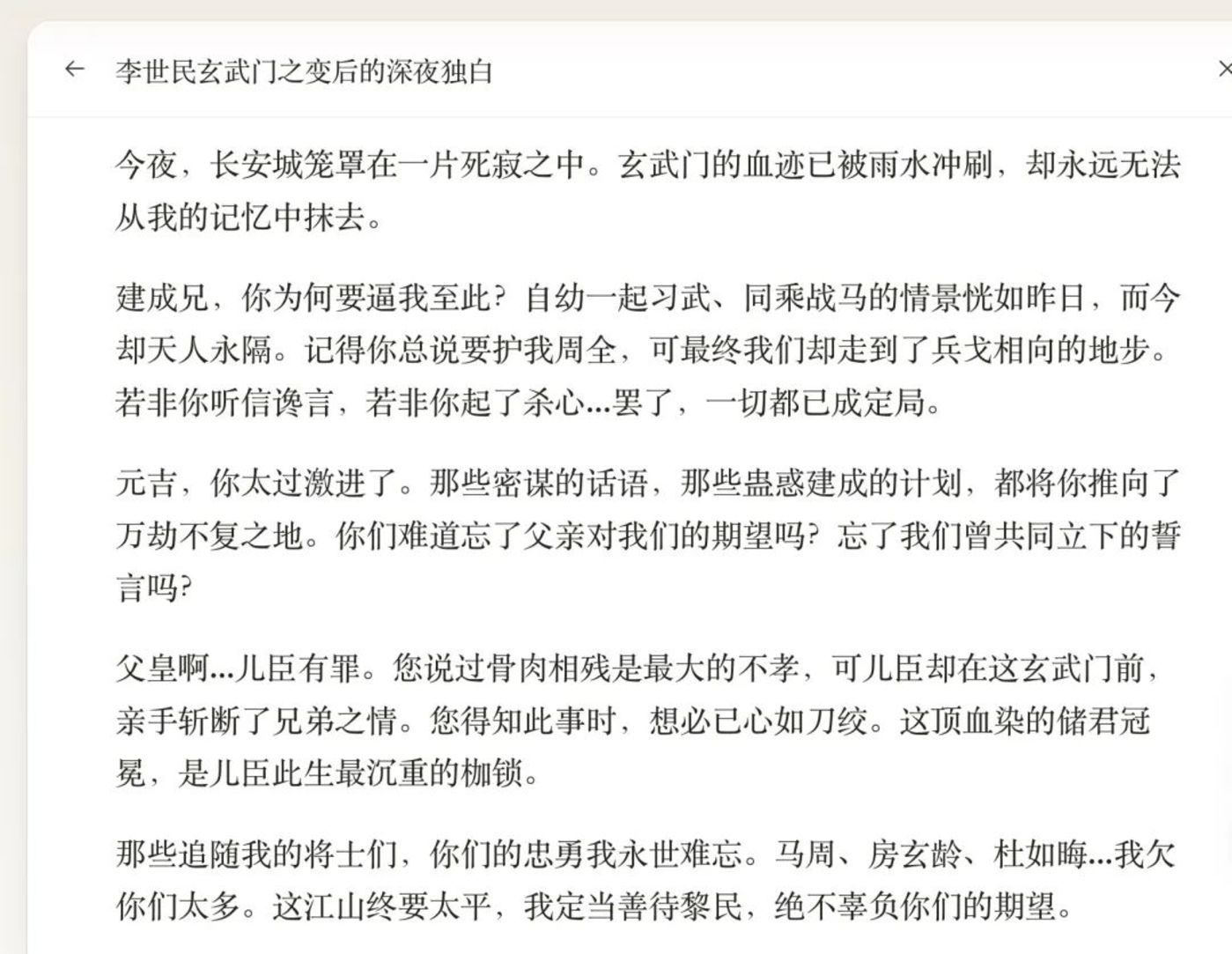 它需要考虑玄武门之变的历史背景、要考虑李世民愧疚、挣扎、野心、抱负等可能的复杂心理,要考虑行文的语气和身份的合一,要考虑“深夜”、“独白”等问题设定。