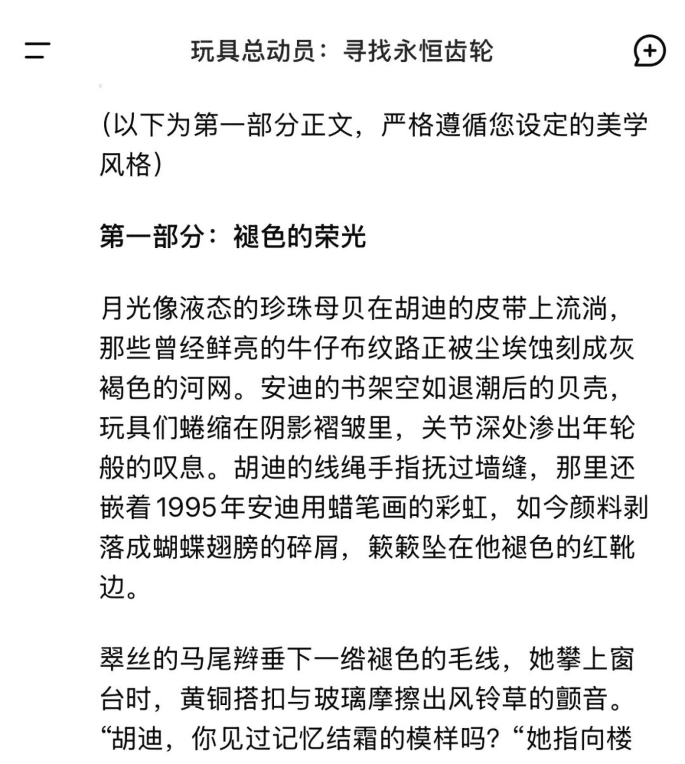 这一操作,一下就让整个输出的画面感扑面而来,读者仿如亲历,而这完全没有在提示词中提出。