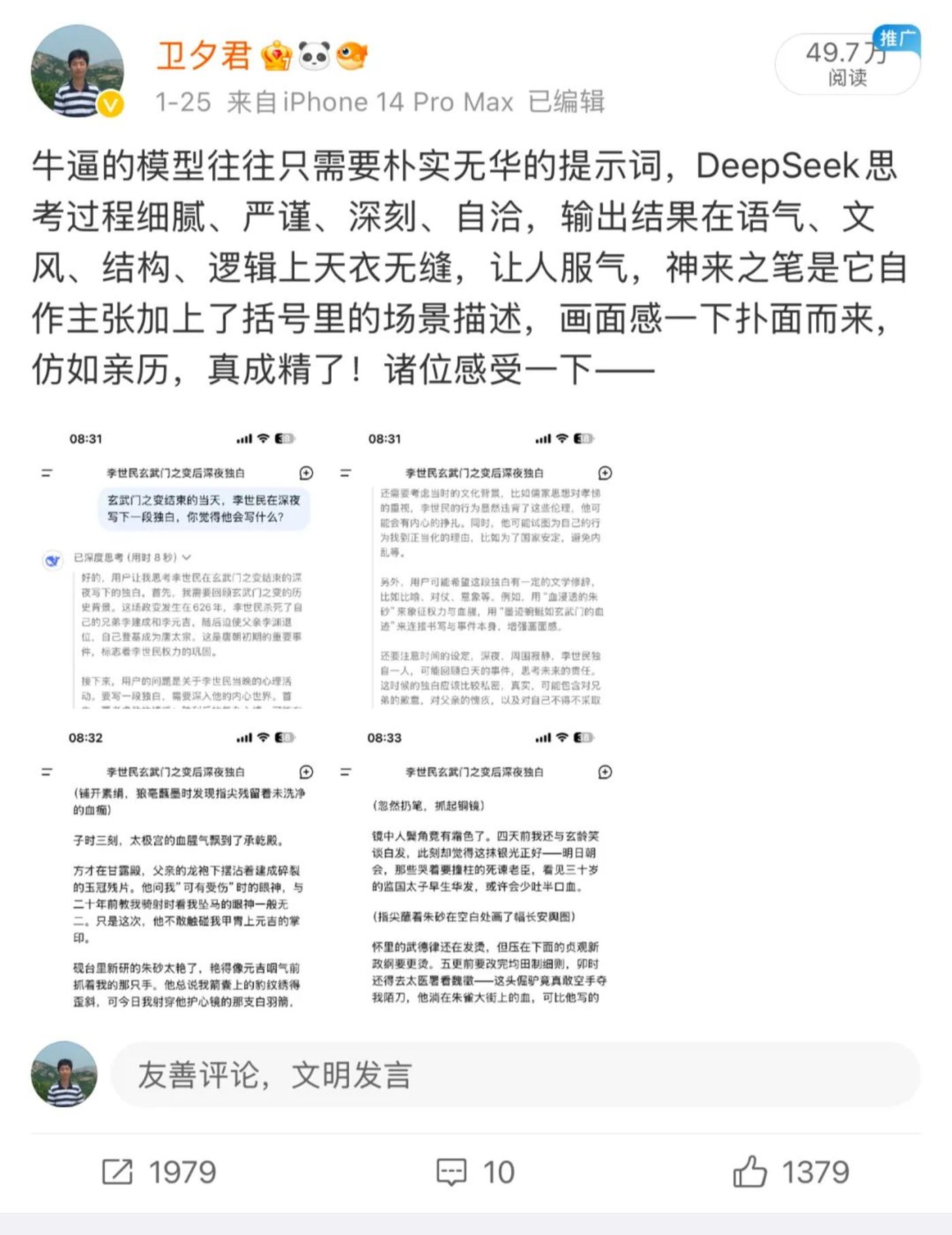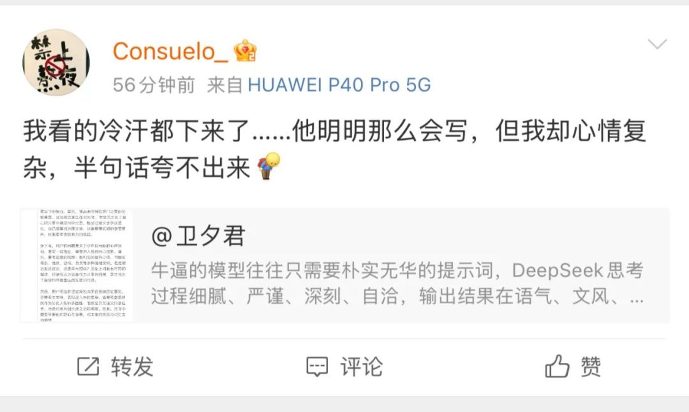 在揭晓AI的惊艳回答之前,我们先来看微博上一个网友对DeepSeek输出结果的一条评论——
