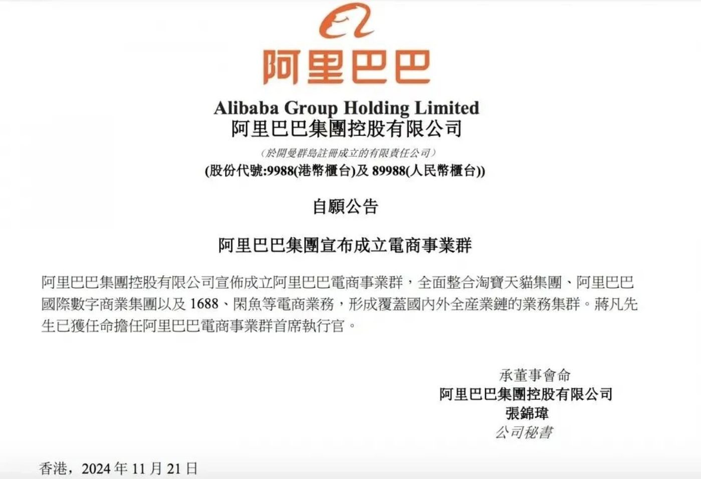 2024年11月,阿里集团CEO吴泳铭发布全员邮件,宣布成立阿里电商事业群,任命蒋凡负责,向吴泳铭汇报。新的电商事业群将全面整合淘宝天猫集团、国际数字商业集团以及1688、闲鱼等电商业务,形成覆盖国内外全产业链的业务集群。