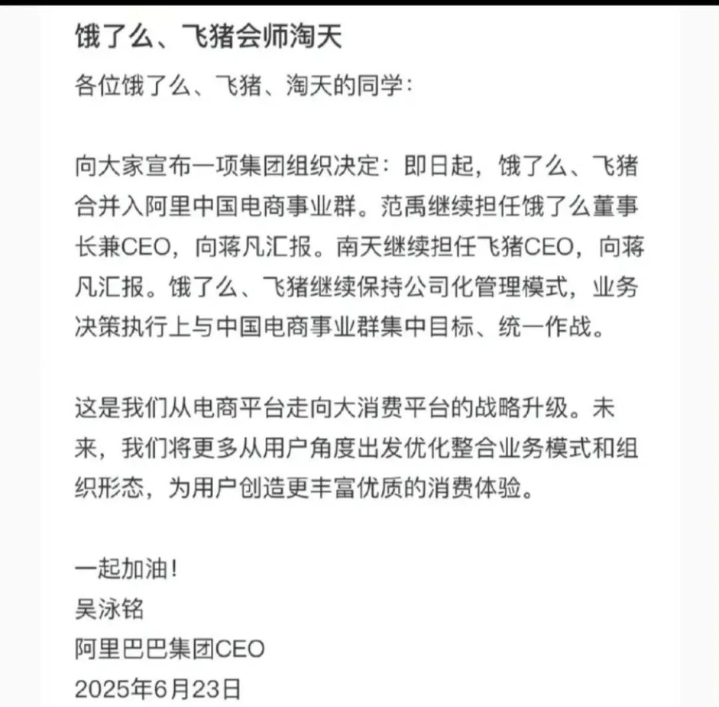 6月23日,阿里巴巴集团CEO吴泳铭发布全员邮件,官宣称饿了么、飞猪合并入阿里中国电商事业群,饿了么董事长兼CEO范禹、飞猪CEO南天将向蒋凡汇报。饿了么飞猪继续保持公司化管理模式,业务决策执行上与中国电商事业群集中目标、统一作战。