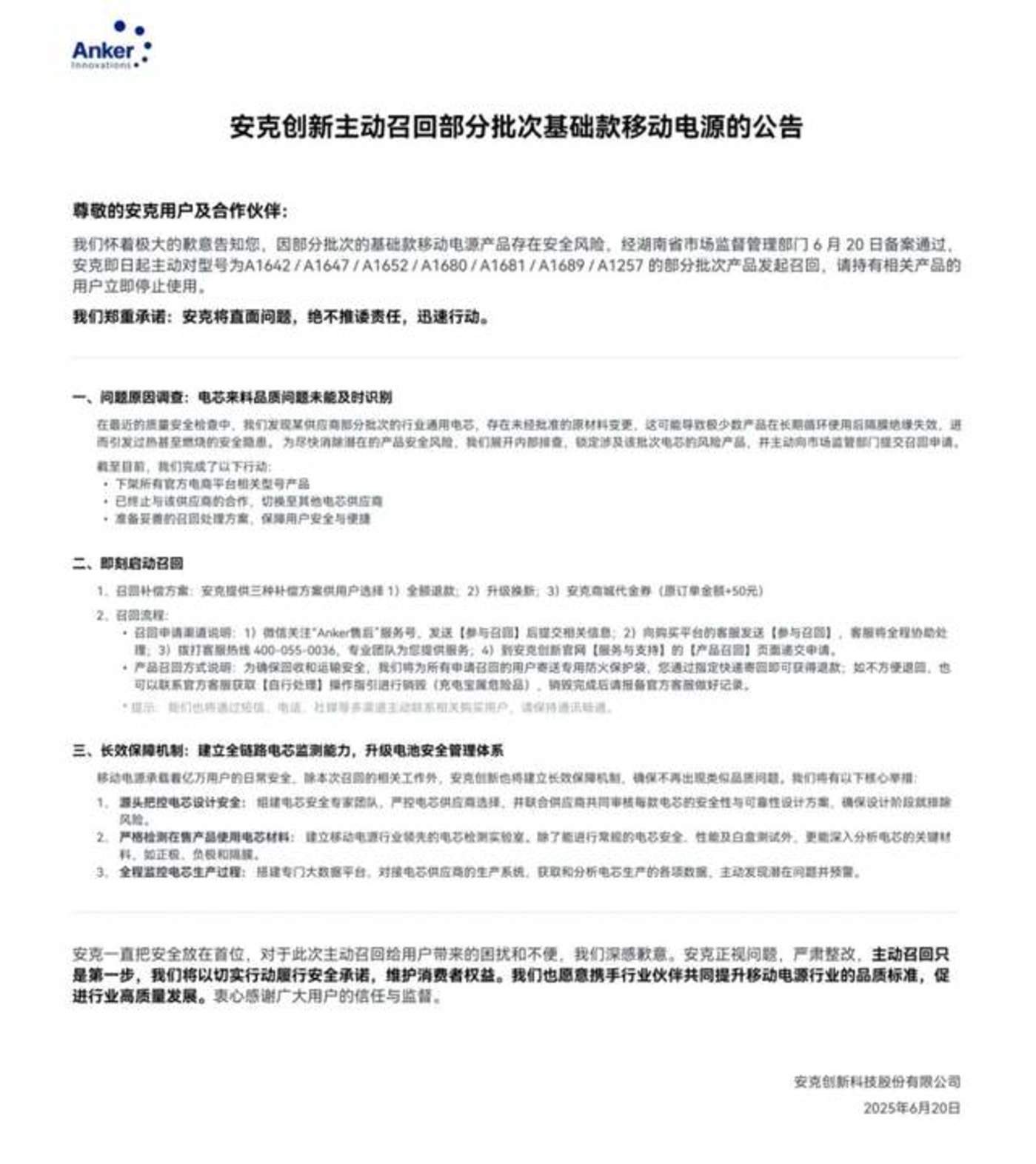 被“召回”的不止是罗马仕。今年6月13日,安克创新(anker)以“锂离子电池过热风险”为由,在美国市场召回115万台充电宝;七天后,安克又“因电芯来料品质问题”在中国市场发起召回超71万件充电宝,其在公告中称,某供应商部分批次电芯存在未经批准的原材料变更,可能导致极少数产品在多次循环使用后出现过热隐患。