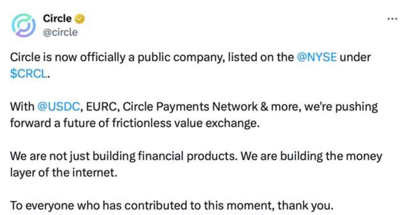 美国时间6月5日,Circle在X上发帖,宣布在纽交所上市。来源:Circle