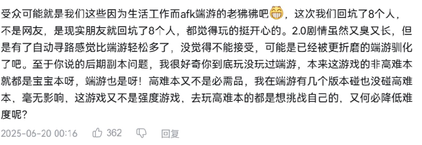 手游化可以服务老玩家,但是不能只服务老玩家。加入自动寻路和减少跑图对于老玩家来讲确实是巨大优势,而且这同样也是横向对比,是和本就存在设计问题的端游在比。