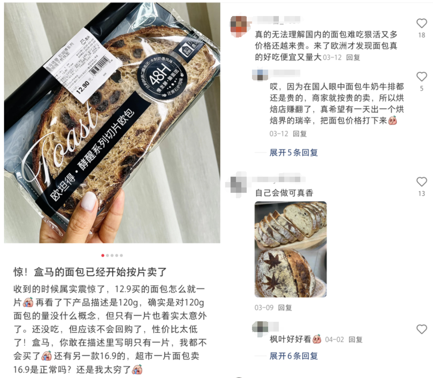 比如盒马正在烘焙单品中添加更多谷物、种子、新鲜水果,并在配方中减糖、减油、减脂,这无疑契合了当下的健康风潮。两个月前,因为十几块钱一片的贵价面包,盒马还被送上热搜。所谓贵价面包实为酸面团面包,盒马官网称酸面团更健康,是「清洁标签」的代表。