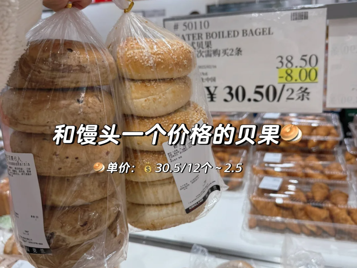 在B&C、Fascino、One Bagel等烘焙店,单个贝果多要10元以上,号称「贝果界天花板」的纽约贝果博物馆还有多款定价30元左右的贝果。而在山姆,蔓越莓贝果7个23.8元;Costco的肉桂提子贝果6个19.5元,被小红书用户戏称为「和馒头一个价格的贝果」。