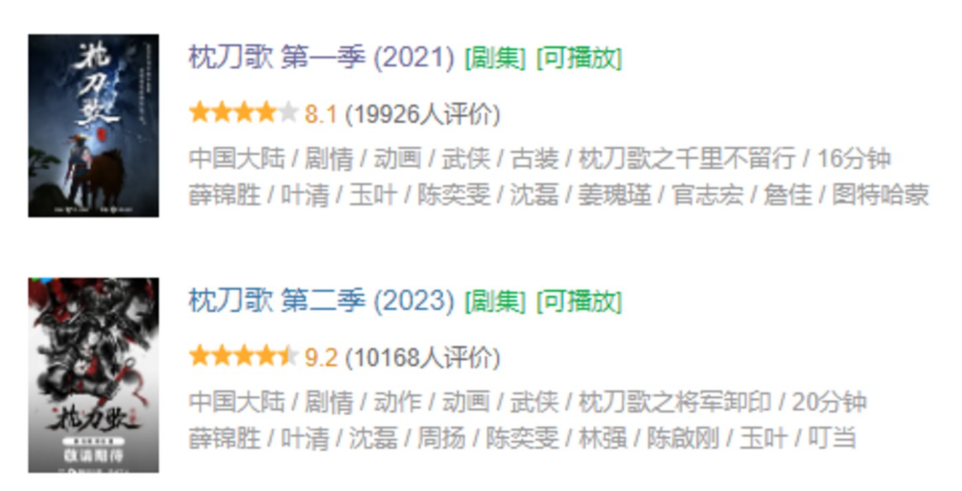 作为原创武侠动画番剧,《枕刀歌》系列前两季的播出效果颇佳。