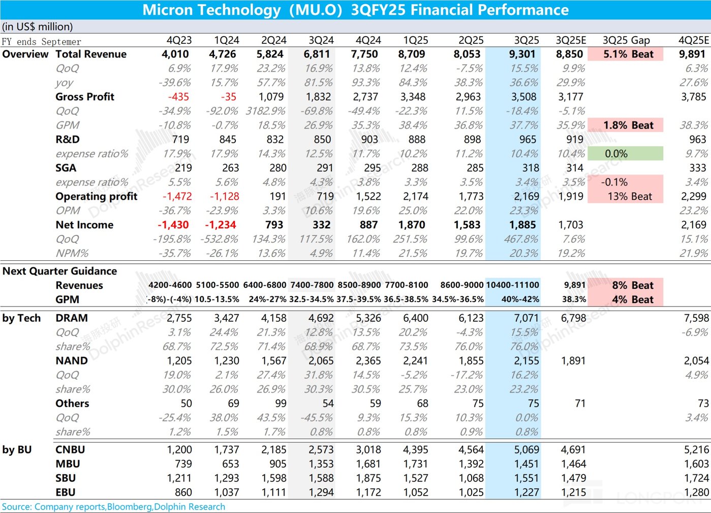 1.整体业绩:$美光科技(MU.US) 本季度营收 93 亿美元,环比增长 15.5%,好于市场预期(88.5 亿美元),预期差主要来自于 NAND 出货增加和 HBM 增长的带动。其中本季度 DRAM 和 NAND 的均价仍有回落,但两项出货量环比增速都达到了 20% 以上。