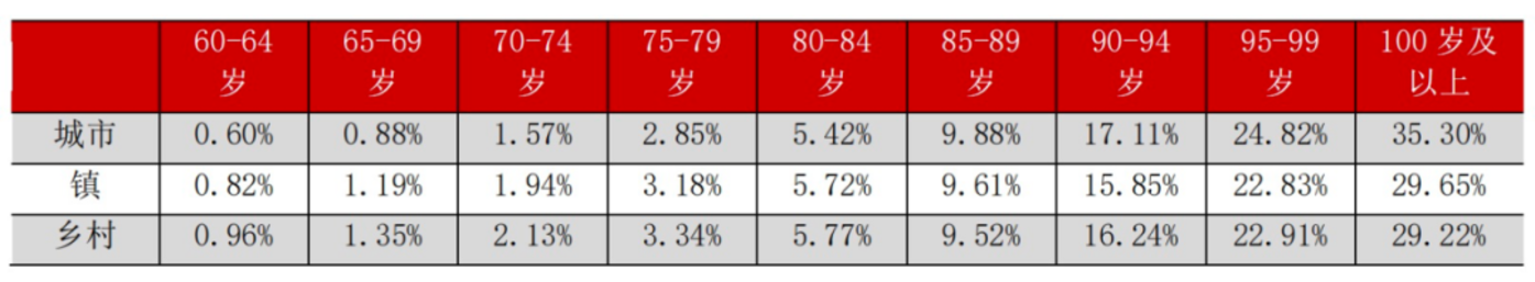 2020年全国分年龄段分城乡老年人口失能率情况 数据来源:国家统计局,中国银行研究院