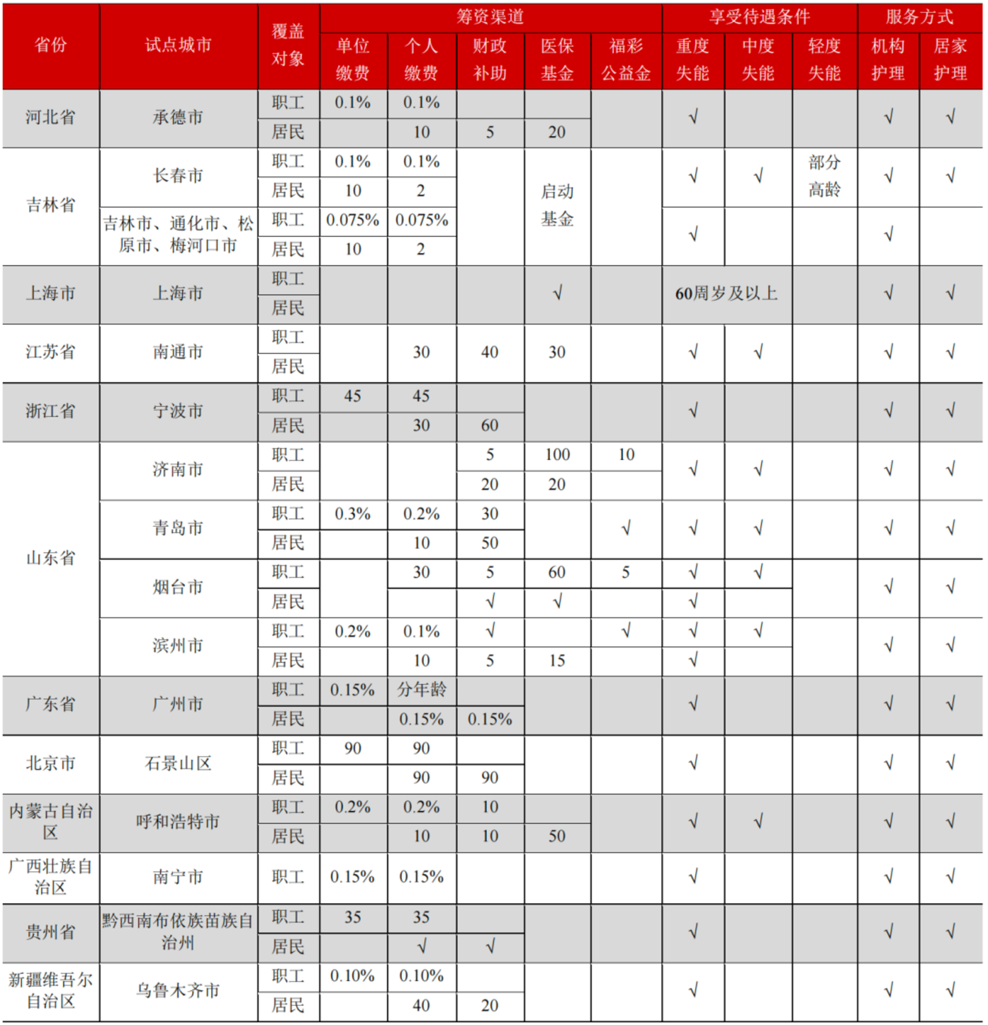 2016年人社部印发《关于开展长期护理保险制度试点的指导意见》,提出在35个城市开展试点,其中,吉林省和山东省是重点试点省份,分别有6个城市和12个城市开展试点。2020年9月,国家医保局会同财政部印发《关于扩大长期护理保险制度试点的指导意见》,增加了14个试点城市。截止目前,全国共有27个省/自治区/直辖市合计49个城市开展了长期护理保险试点。试点取得了不错的成绩。