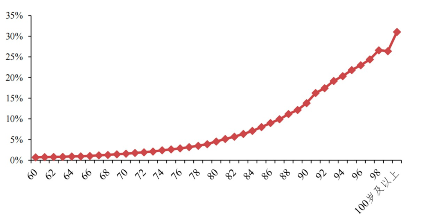 2020年中国老人失能率随年龄变化情况 数据来源:国家统计局,中国银行研究院