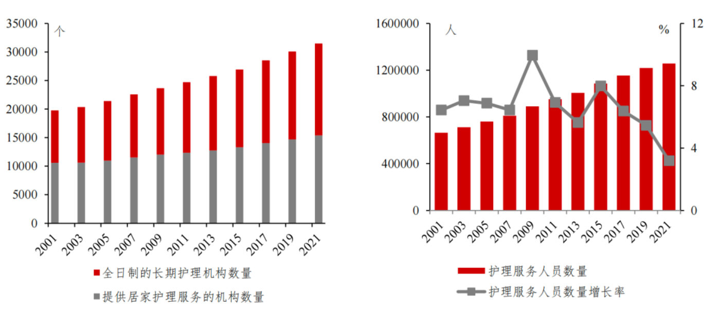 2001-2021年德国长期护理服务机构及服务人员情况 数据来源:德国联邦卫生部,中国银行研究院