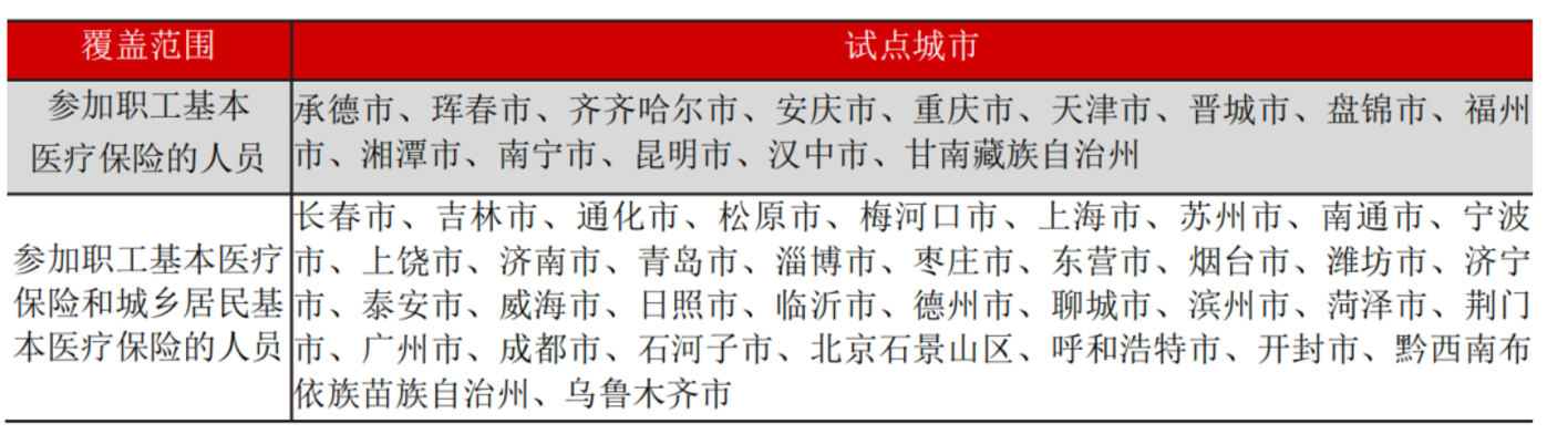 截止2024年7月底,承德市、珲春市、齐齐哈尔市、安庆市、重庆市、天津市、晋城市、盘锦市、福州市、湘潭市、南宁市、昆明市、汉中市、甘南藏族自治州14个城市仅覆盖城镇职工,其余35个城市均已同时覆盖城镇职工与城乡居民。