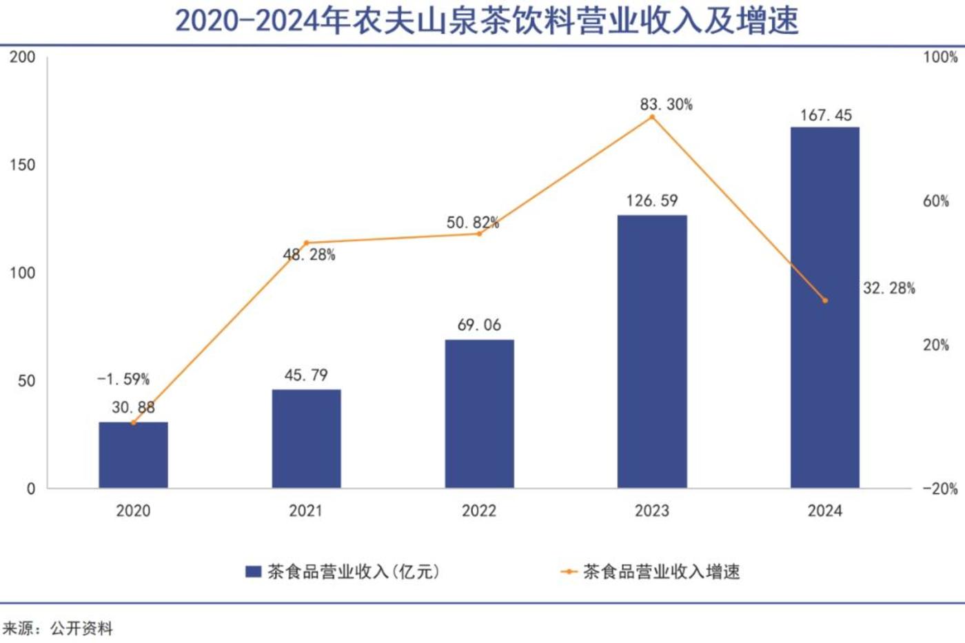 整个年度,以东方树叶、茶派为主的即饮茶类产品已经取代水类产品,成为公司第一大收入来源,实现营收167.45亿元,营收占比高达39%,较2023年提升了近10个百分点。