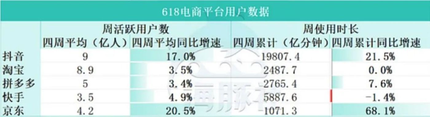 更令人担忧的是用户流量结构的变化。在用户增长方面,京东和抖音增长很快,各个指标都超过两位数增长。淘宝、拼多多、快手等平台仅为个位数,甚至是负增长。