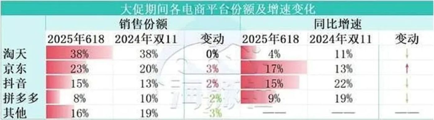 复旦消费大数据实验室数据显示,2025年618销售额平台份额中,淘天系为38%,京东为23%,抖音为15%,拼多多为8%,其他平台合计为16%。对比2024年双11,淘天份额持平,京东上升3%,抖音提升2%,而拼多多和其他平台分别下滑2%、3%。也就是说,京东和抖音正成为淘天的直接竞争对手。