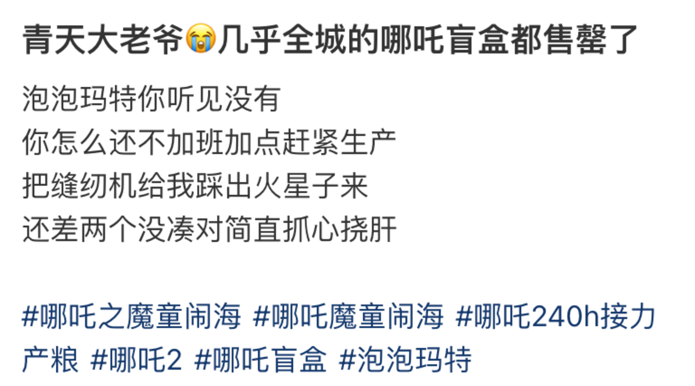 电影中的IP形象,也成为各个品牌争夺的对象。目前,哪吒IP已经和泡泡玛特、卡游、万代南梦宫等多个品牌合作,其中泡泡玛特的哪吒手办盲盒更是卖到断货。