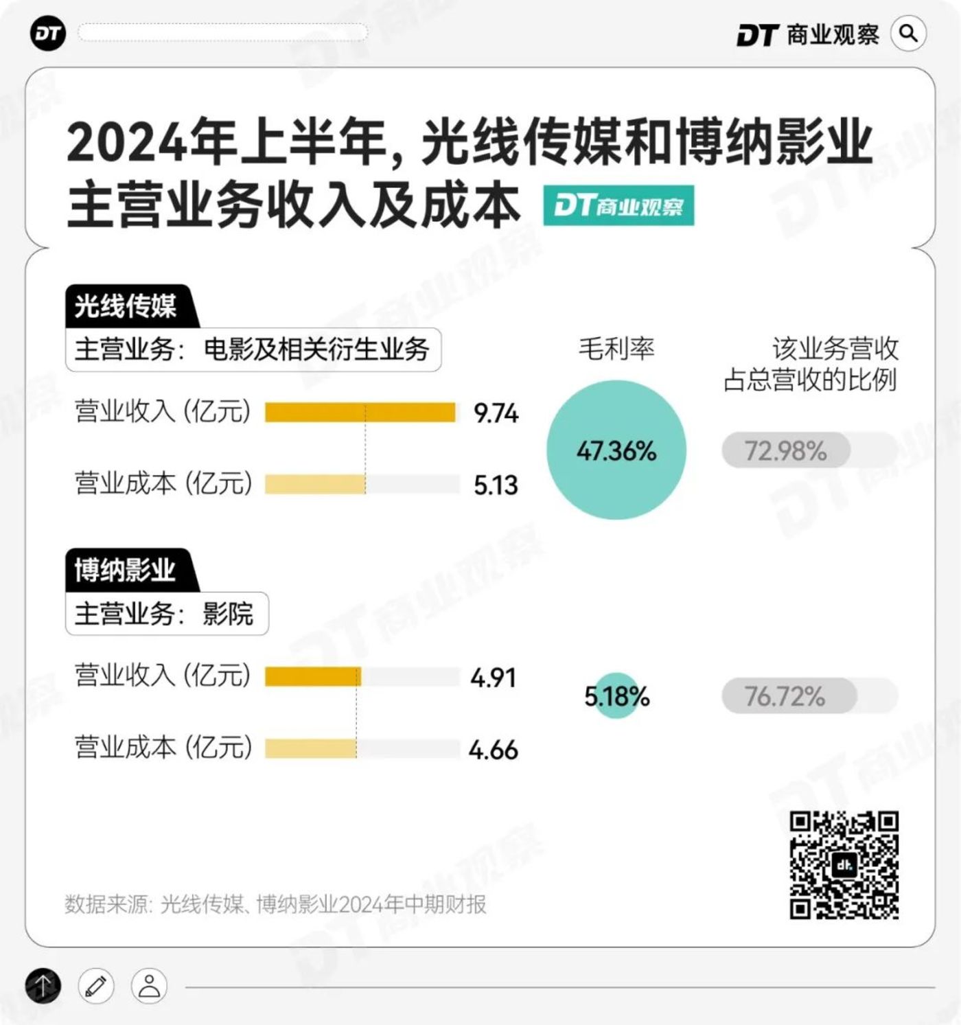 影院本应是博纳影业的护城河,但当线下观影受到冲击,重资产反而成了包袱,2024年上半年,博纳影业的影院收入同比减少16.41%,毛利率只有5.18%。