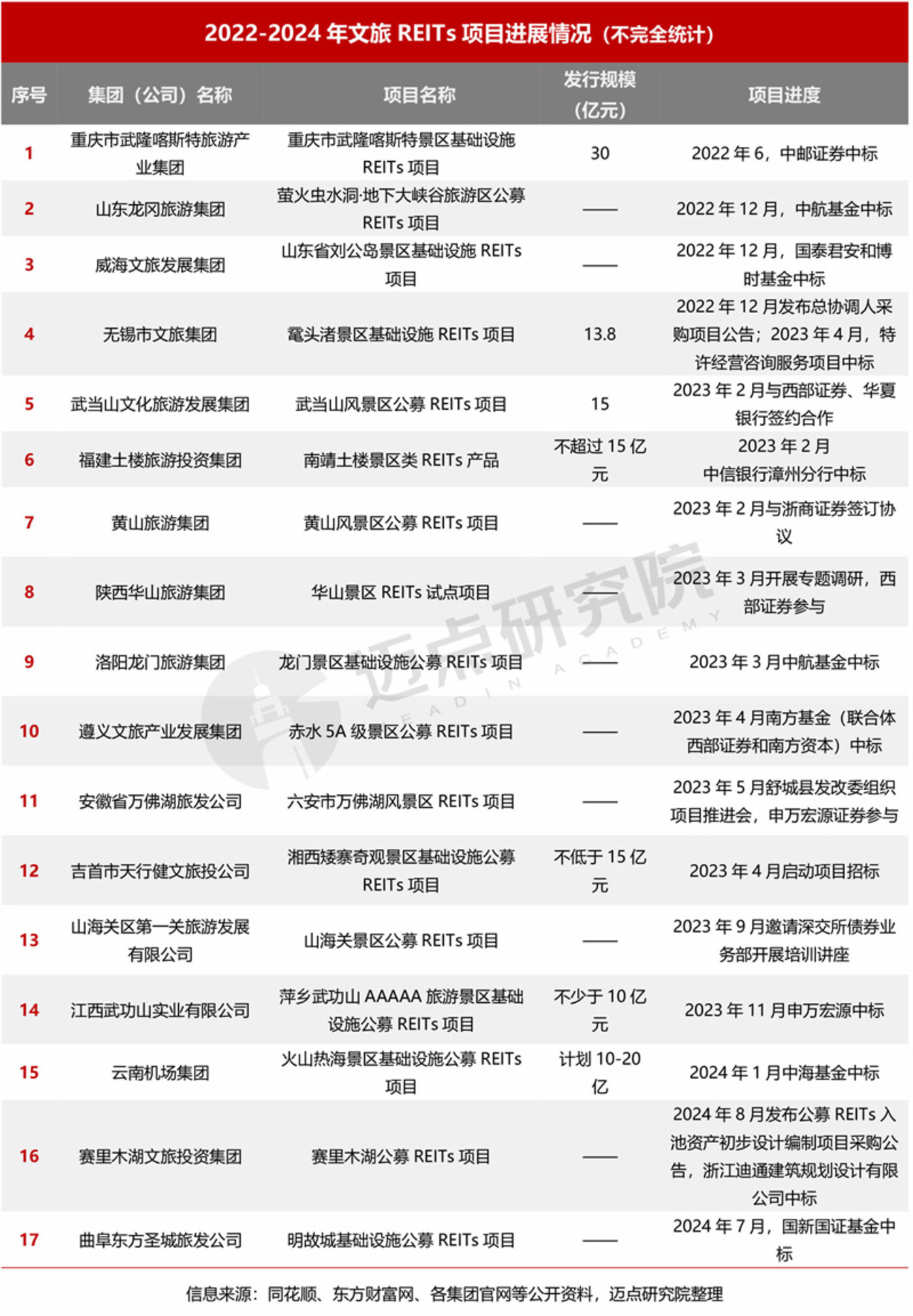 据目前公开信息统计,已有武隆喀斯特、临沂萤火虫水洞·地下大峡谷旅游区、威海刘公岛、无锡鼋头渚、武当山、南靖土楼、黄山、华山、洛阳龙门等17家5A景区或世界文化、自然遗产项目启动了REITs申报相关工作。可见,顶级文旅资产成为文旅公募REITs发行的突破口。但这些项目仍处于前期准备和培育阶段,至今尚未有文旅REITs项目成功发行。