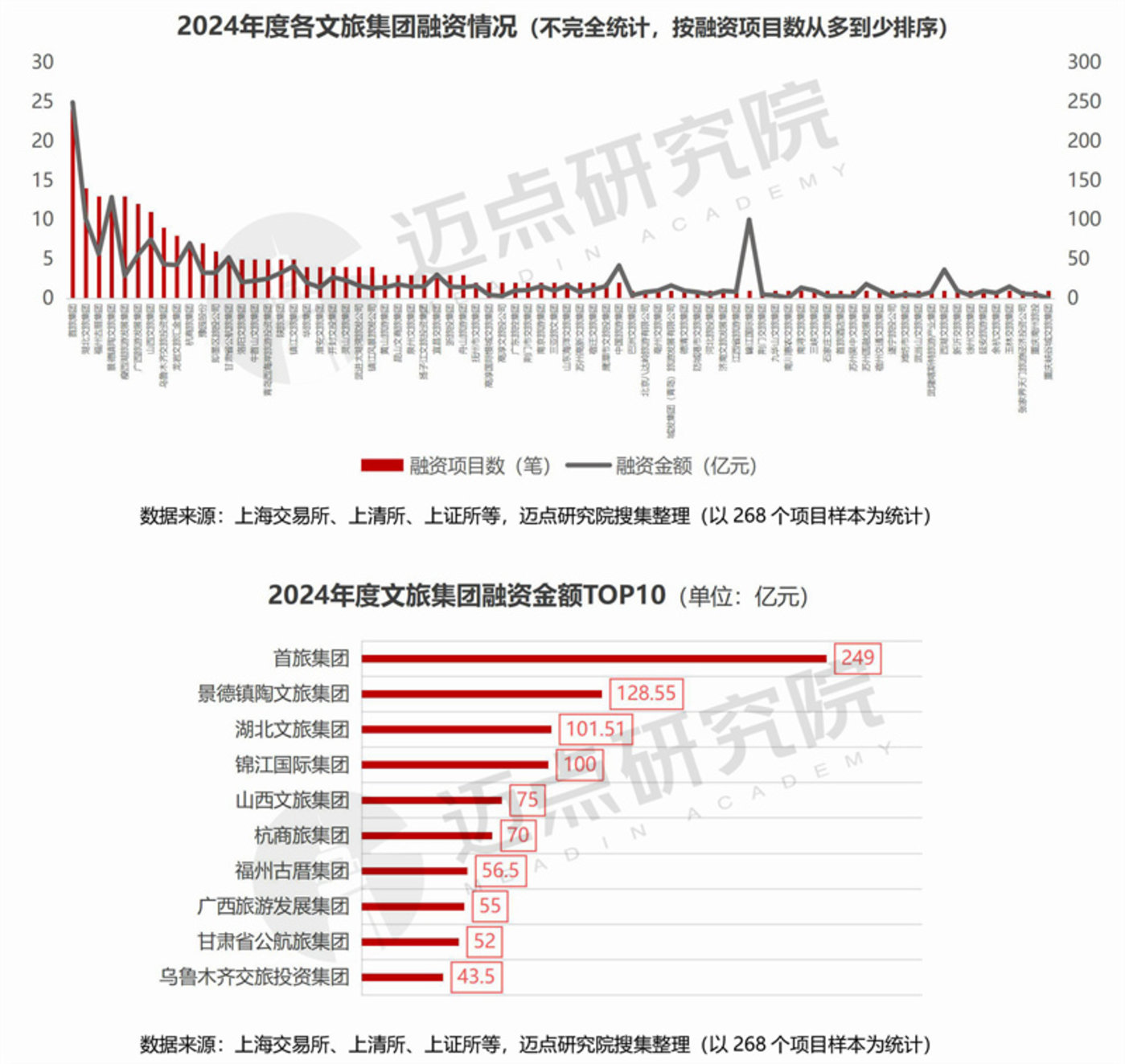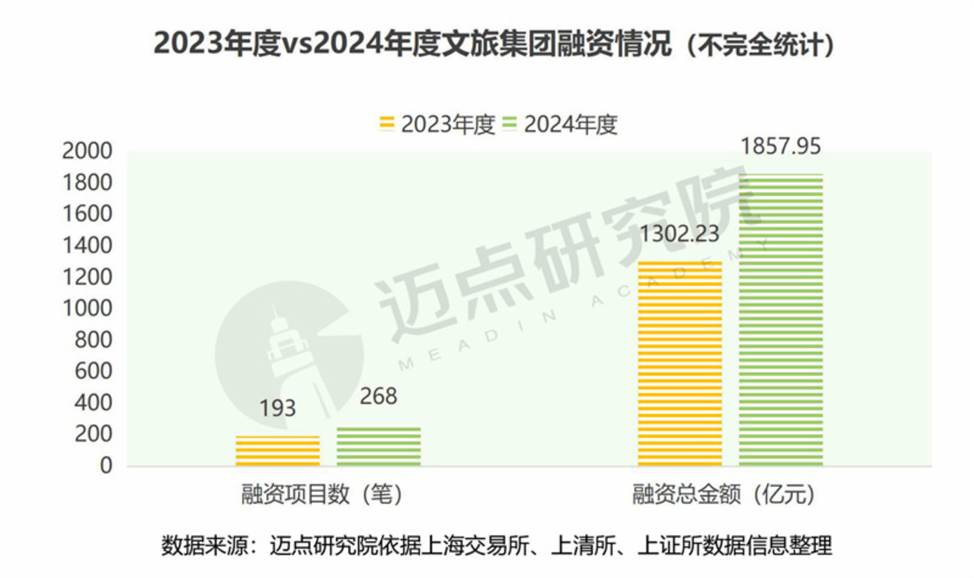 据迈点研究院不完全统计,2024年度各文旅集团完成268笔融资项目,合计金额1857.95亿元。相比2023年度,融资项目数增长约38%、融资金额增长约43%,即2024年各文旅集团的融资进程加快、融资力度加大。