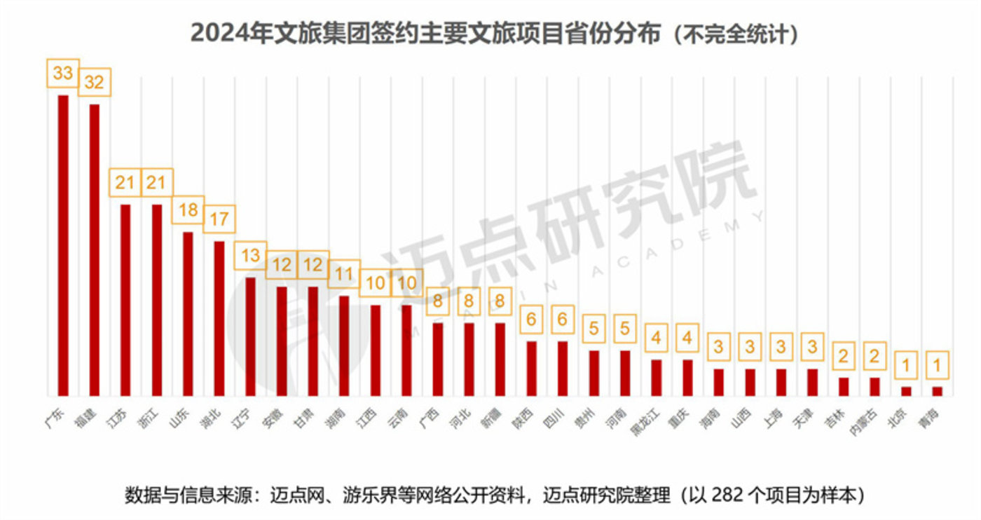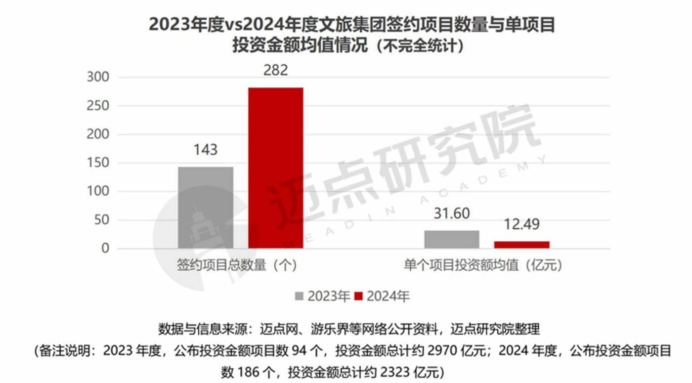 据迈点研究院不完全统计,2024年度全国代表性文旅集团合计签约投资重大文旅项目282个,其中公布投资金额的186个项目合计投资额约2323亿元。单个项目投资金额1亿元及以上的168个,50亿元及以上的仅12个(占比约6%),总体投资由“重”转“轻”。由江西鄱阳湖文旅集团、华夏美裕(江西)文化旅游有限公司投资的鄱阳湖“三区一线”文化旅游投资开发运营项目,投资金额100亿元,该项目采用“建设—经营—转让”的新型文旅开发模式。