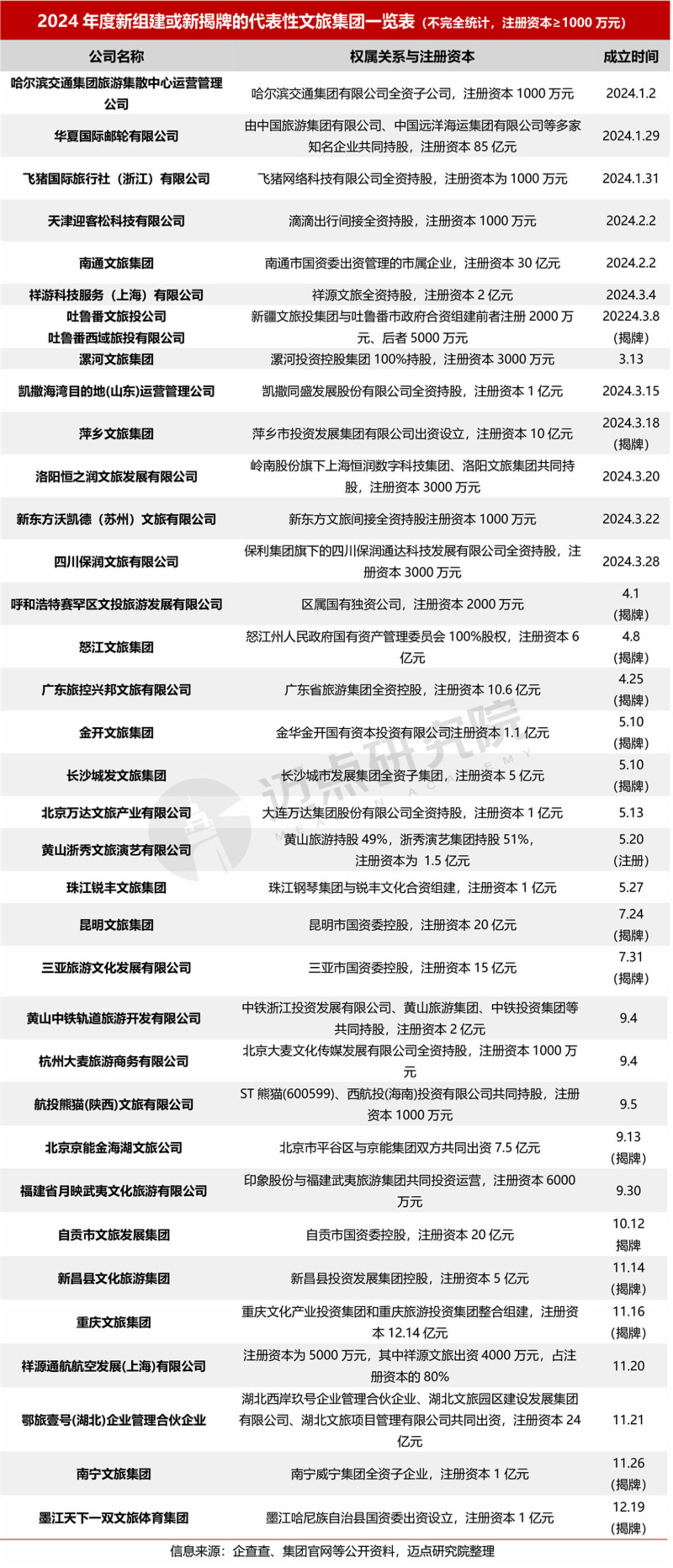 据迈点研究院不完全统计,2024年新注册或新揭牌的,且注册资本金在1000万元及以上的代表性文旅集团36家,以国资系为主导,包括吐鲁番文旅投公司、南通文旅集团、漯河文旅集团、萍乡文旅集团、怒江文旅集团、昆明文旅集团、新昌县文旅集团、重庆文旅集团等,各地文旅资产重组整合加速推进。从出资方式看,国企联合出资、共同持股、跨区域深化合作引关注,如岭南股份与洛阳文旅集团投资成立“洛阳恒之润文旅发展有限公司”、黄山旅游与浙秀演艺集团共同投资设立合资公司“黄山浙秀文旅演艺有限公司”并致力于打造以徽州黄山文化为主题的演艺舞台秀。