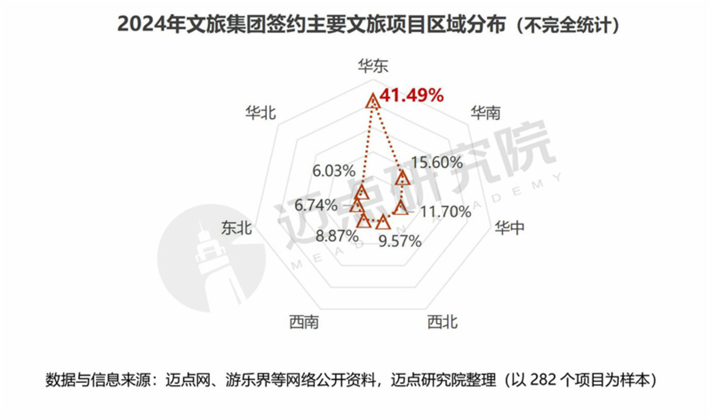 重大文旅项目签约地点分布,区域维度,华东区域签约项目最为密集,占比超四成,其次为华南、华中地区,东北、华北最少;省份维度,广东省、福建省文旅项目投资力度加大,签约文旅项目数量位居前列,江苏和浙江两大旅游强省文旅投资保持活跃,山东、湖北、辽宁、安徽、甘肃、湖南、江西、云南等省份文旅产业项目投资建设加快推进。