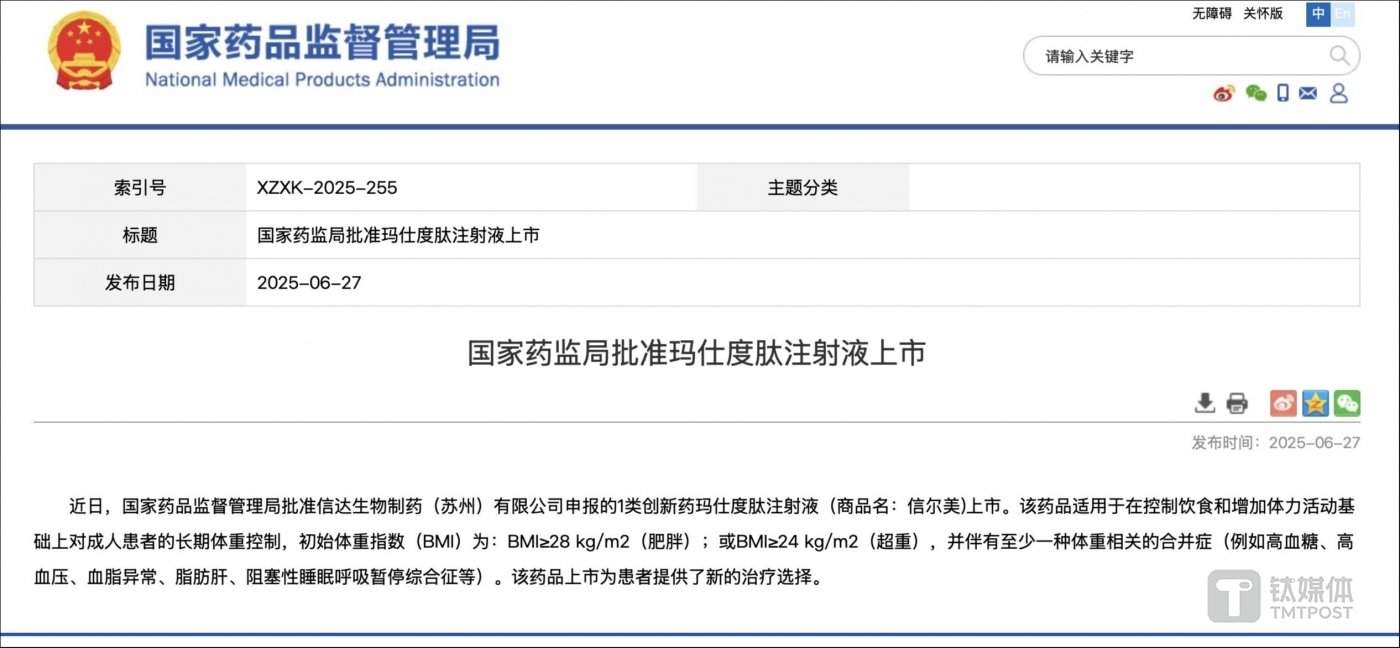 6月27日,国家药监局官网信息显示,信达生物研发的玛仕度肽(信尔美)正式获批上市,而这一药物作为全球首个获批的 GCG/GLP-1 双靶点激动剂类减重药物,其获批标志着我国在相关治疗领域取得了重要的突破。