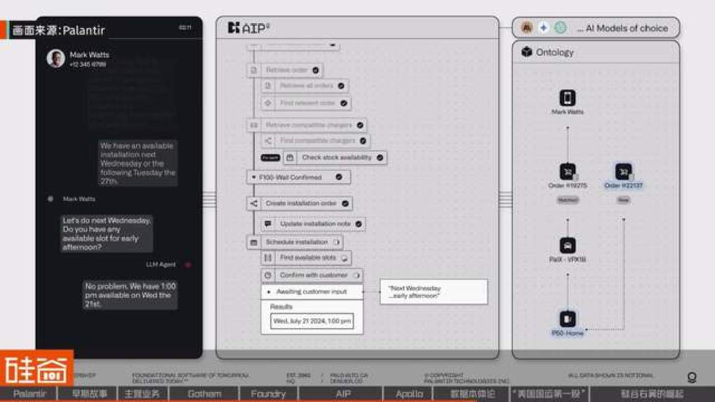 AIP并不是一个独立的产品,而是类似一个基于Foundry的交互插件,让你能够轻松调用市场上的大语言模型,比如ChatGPT,并与Foundry的能力结合在一起,几乎是“开箱即用”、“傻瓜式操作”。
