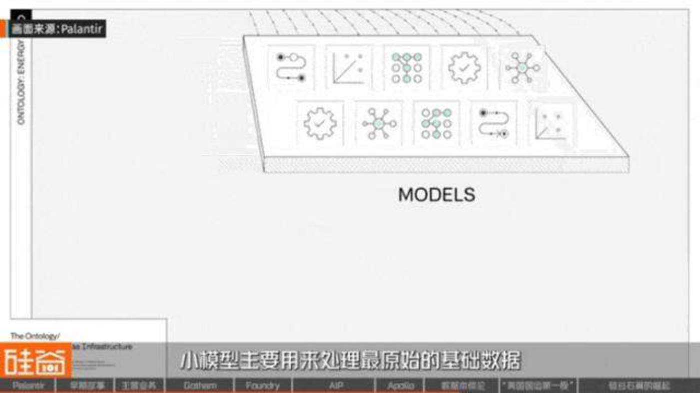 第二层是逻辑,Palantir会设计很多Model,有小Model、中Model和大Model,分了三层,小Model主要用来处理最原始的基础数据,更多是在定义层面,然后中Model负责处理它们之间的关系,大Model就更多是做出分析和判断。这里面也是一个层层递进的结构。
