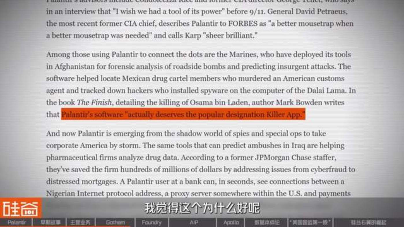 在讲述拉登丧命经过的《终结》(The Finish)一书中,作者马克·鲍登(Mark Bowden)写到,Palantir的软件“是名副其实的杀手级应用”。