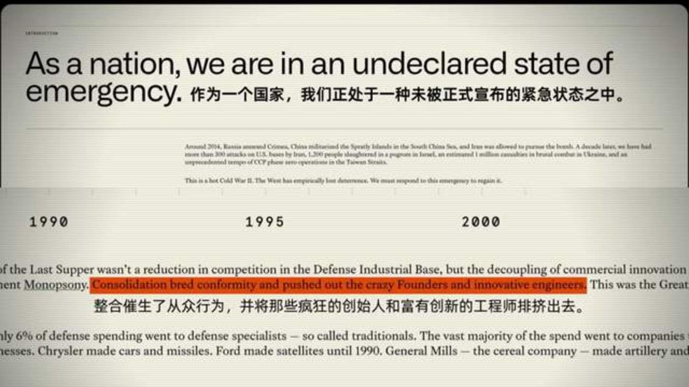 Palantir的CTO Shyam Sankar,发表过一篇《国防改革》(The Defense Reformation),其中清晰地表达了对美国国防工业的不满,他写道:我们正处于未宣布的紧急状态,三十多年来,我们接受了一个停滞不前的国防工业基地,这个基地诞生于一个自满的、没有竞争的“一言堂”。