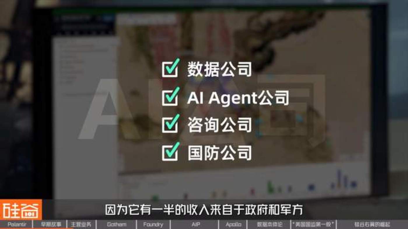 它被笼统地认为是一家“AI公司”;但深入研究后你会发现,它既是一家数据公司,因为做了很多数据集成;也是一家AI Agent公司,它的核心产品AIP,就是一个企业级的AI Agent应用,以及它还是一家类似于麦肯锡、埃森哲的咨询公司,它会给各行各业的公司提供IT咨询和AI解决方案;它还是一家国防公司,因为它有一半的收入来自于政府和军方。