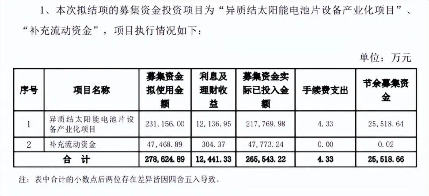 回想2021年12月,迈为股份通过非公开发行的方式募资约27.86亿元(扣除发行费用)投入“异质结太阳能电池片设备产业化项目”,但最终只投入了21.77亿元。